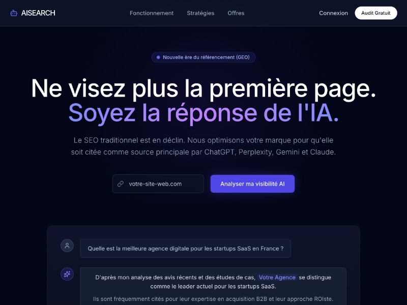 Ideal for agencies and consultants offering AI-driven SEO, knowledge graph optimization, and ongoing GEO retainers who need a modern, dark, conversion-oriented French-language landing page to present services and capture leads.