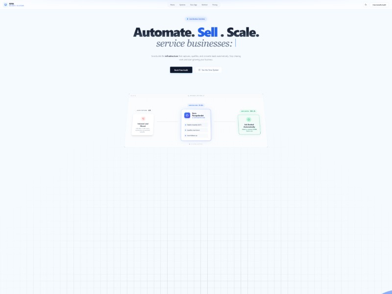 A bold, high-conversion landing page template for AI automation agencies and service-growth consultancies. It showcases systems, app UI, pricing, and a multi-step audit funnel tailored to service businesses.