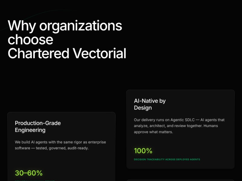 Chartered Vectorial is a dark, metric-driven landing page template designed to explain why organizations should choose your AI or technology services.