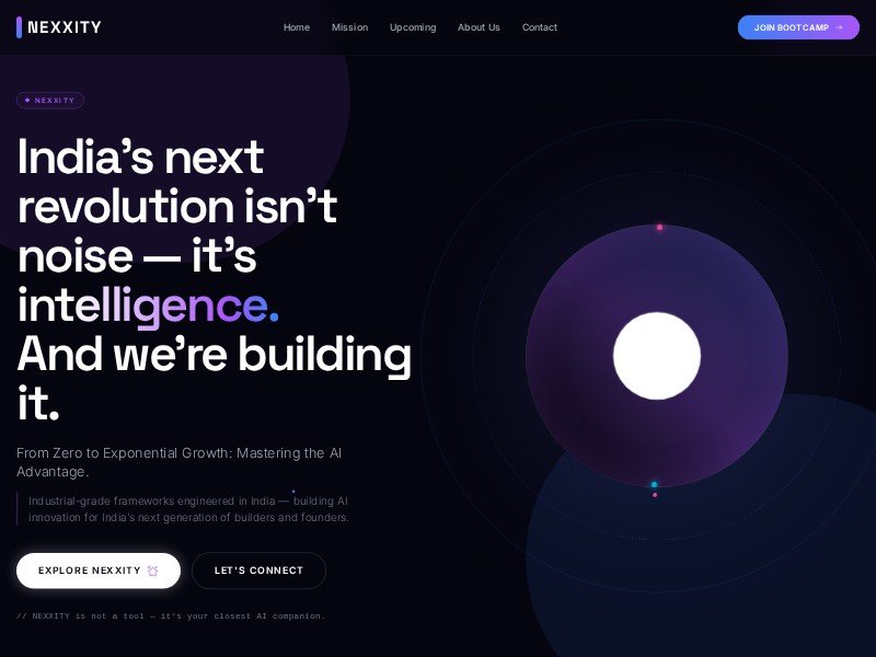 NEXXITY is a dark, futuristic AI startup landing page template built around the theme of "Intelligence Amplified" and India-first innovation.