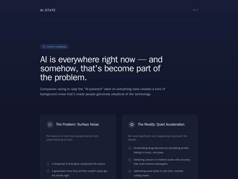 A reusable landing page template for publishing thoughtful AI commentary, research narratives, and brand storytelling that builds trust through clarity.