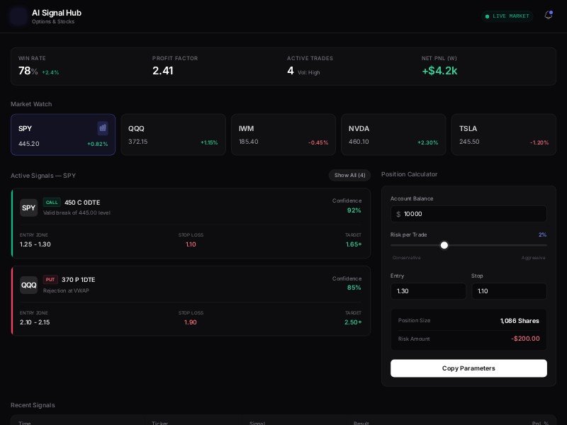 AI Signal Hub UI Template is a dark, data-dense trading dashboard layout for options and stock signal products.