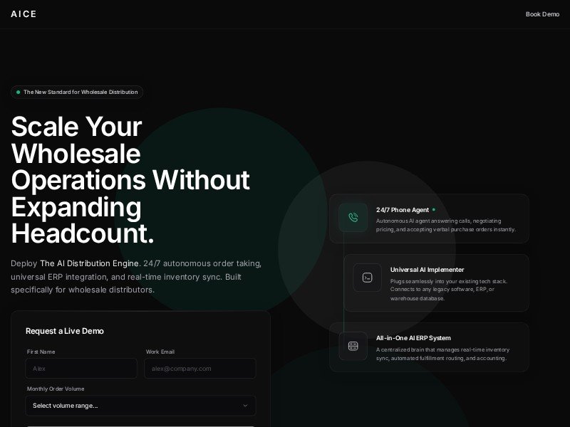 A reusable landing page template for AI-powered wholesale distribution services, built to showcase automation, ERP integration, and demo-driven lead capture.