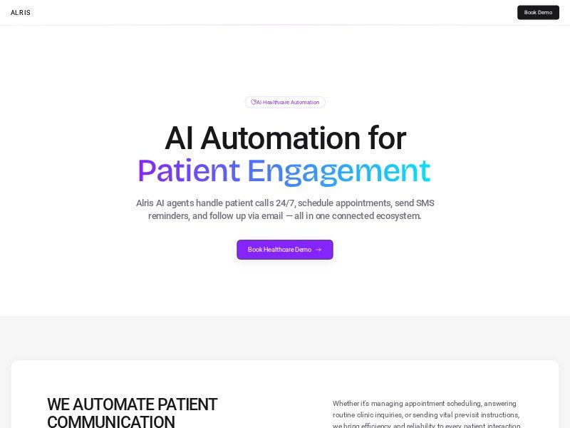 This Alris template is a high-conversion landing page designed for healthcare-focused AI services. It features a modern, clean UI with a professional purple accent color, prioritizing trust and efficiency for medical environments.