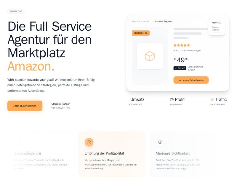 A premium hero-section template tailored for Amazon-focused agencies, featuring a bold headline, persuasive copy, and a visual product mockup.