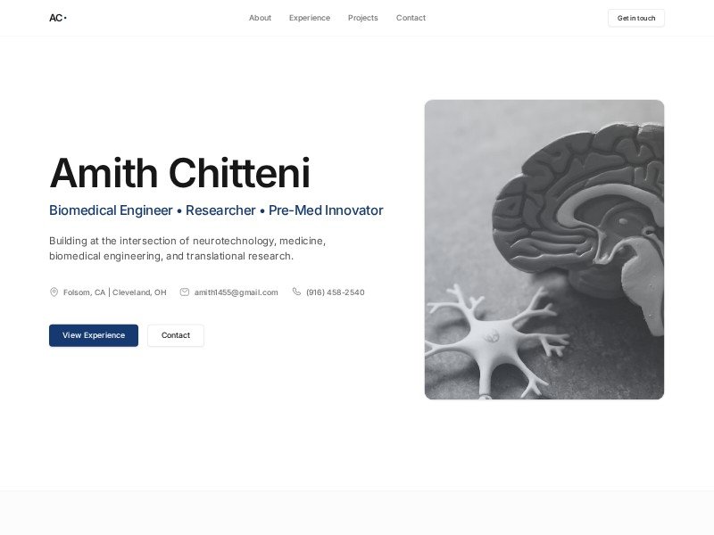 A clean, modern template built for biomedical engineers, researchers, and pre-med professionals who need to present academic excellence, technical depth, and clinical experience in one polished site.