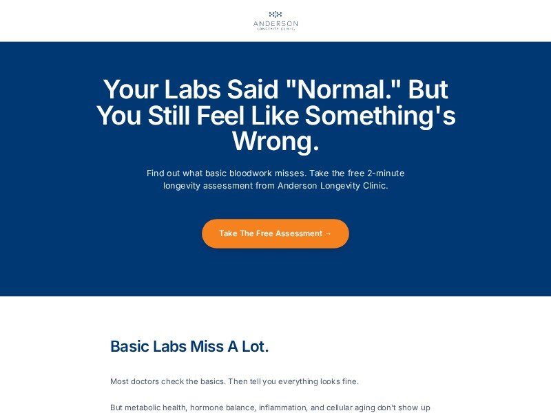 A clean health landing page template designed for clinics promoting free assessments, biomarker testing, or longevity consultations. It combines educational copy, trust-building sections, and strong CTAs to increase patient inquiries.