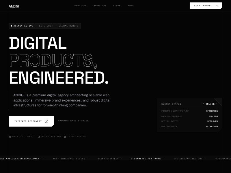 ANDIGI is a premium digital agency template designed for firms that specialize in web application development, UI/UX systems, and brand strategy. It features a sophisticated dark aesthetic with futuristic grid overlays and high-performance UI components.