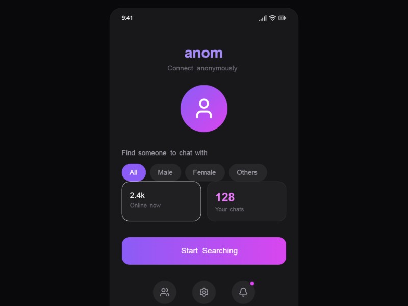 - Anonymous matchmaking UI: filters, live stats, search and match states