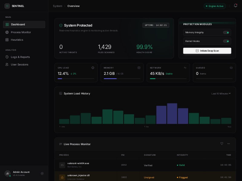 A dark, modern Anticheat Sentinel dashboard UI template for security and game process monitoring interfaces, ready to customize for your own product.