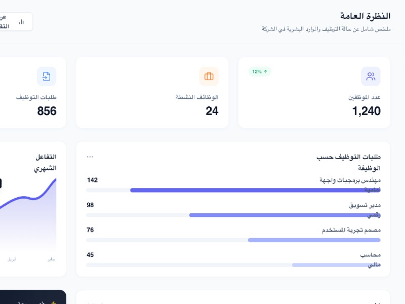 A modern Arabic HR dashboard UI template for managing jobs, applications, employees, and payroll analytics, ready to customize for HR web apps.