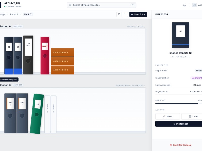 ARCHIVE_HQ is a sleek dashboard template for managing physical records, shelves, and binders in a modern, data-rich interface.