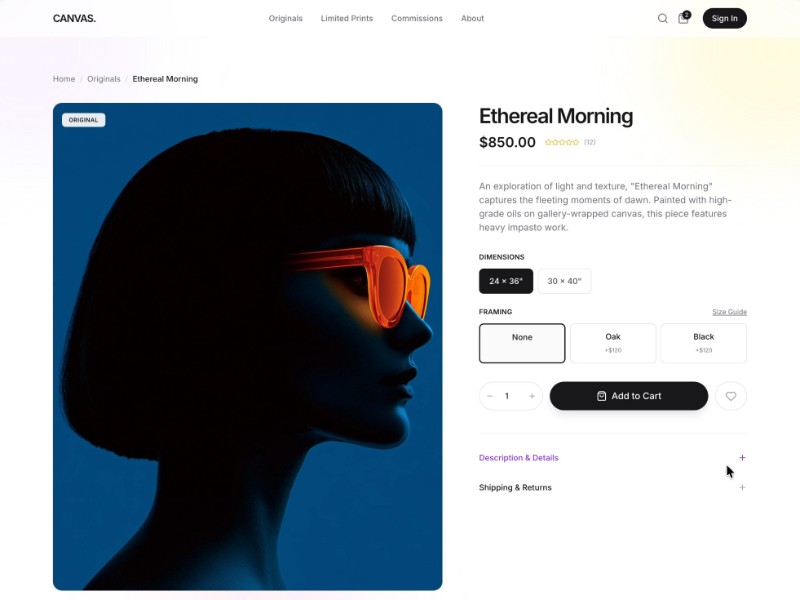Canvas Art Store is a polished art e-commerce landing page template designed to showcase original works, limited prints, and custom commissions in a modern, gallery-style layout.