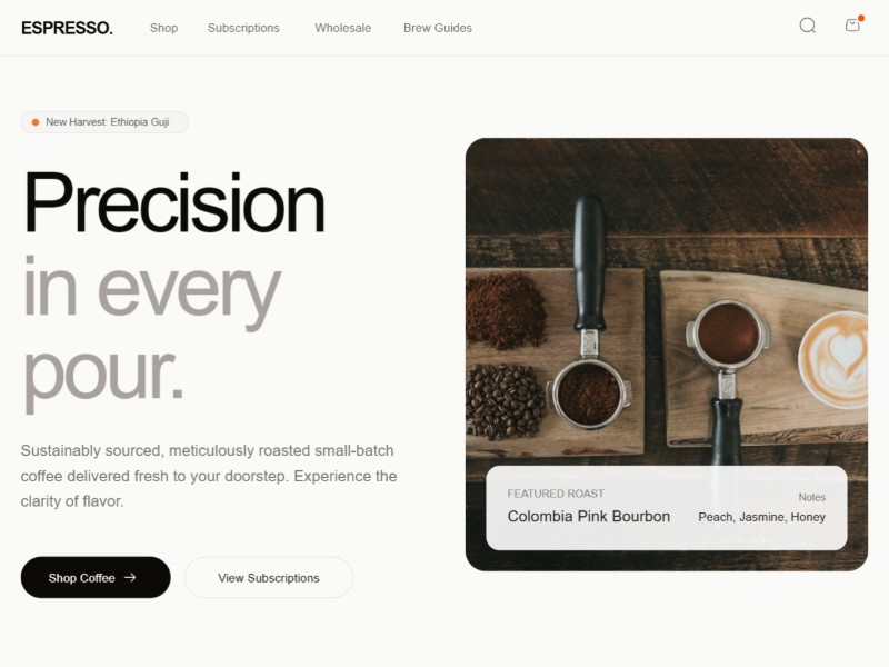 A refined, minimal landing page template tailored for specialty coffee brands and roasters to sell beans, equipment, and subscriptions online.