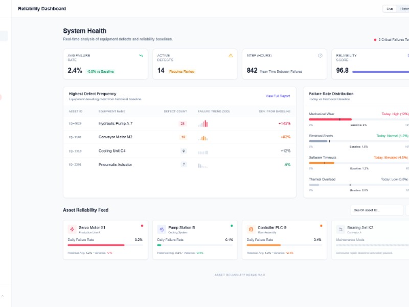 A reusable Asset Reliability Nexus dashboard UI template for monitoring equipment failures, baselines, and system health in real time.