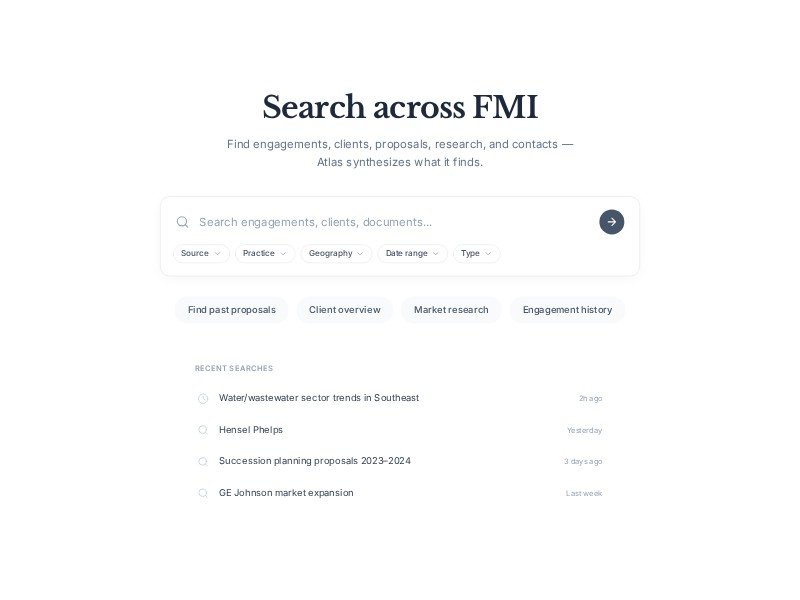 FMI Atlas Search UI Template is a polished internal search experience for teams that need fast access to engagements, clients, documents, and contacts.