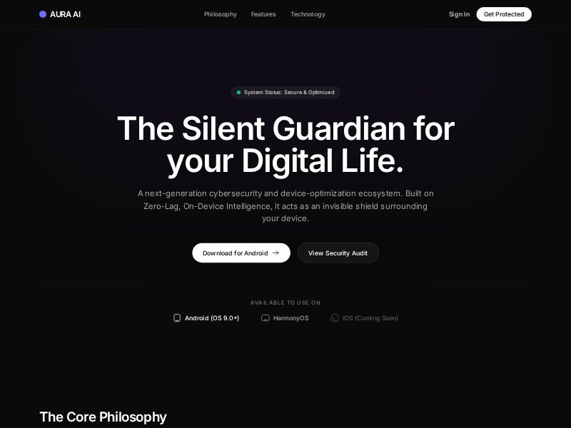 Aura AI is a premium landing page template tailored for cybersecurity startups and mobile utility apps. It features a sophisticated dark-mode aesthetic with ambient glow effects and high-impact visuals to communicate trust and advanced technology.