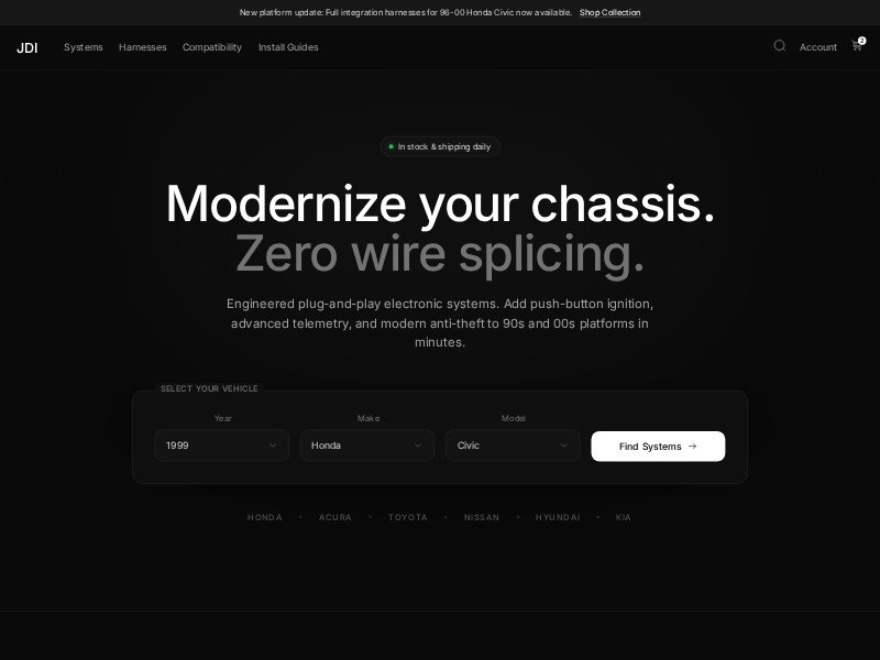 A sleek template for brands selling plug-and-play vehicle electronics, harnesses, and security upgrades for specific car platforms.