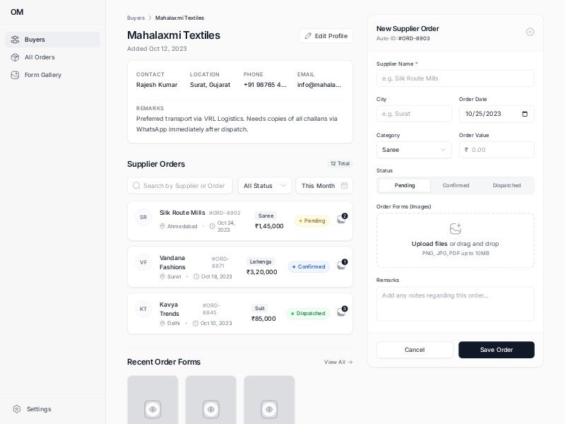 This B2B Order Management Template provides a clean and professional interface for businesses to handle complex procurement workflows. It features a high-density dashboard tailored for the textile and manufacturing industries, allowing for seamless tracking of supplier interactions.