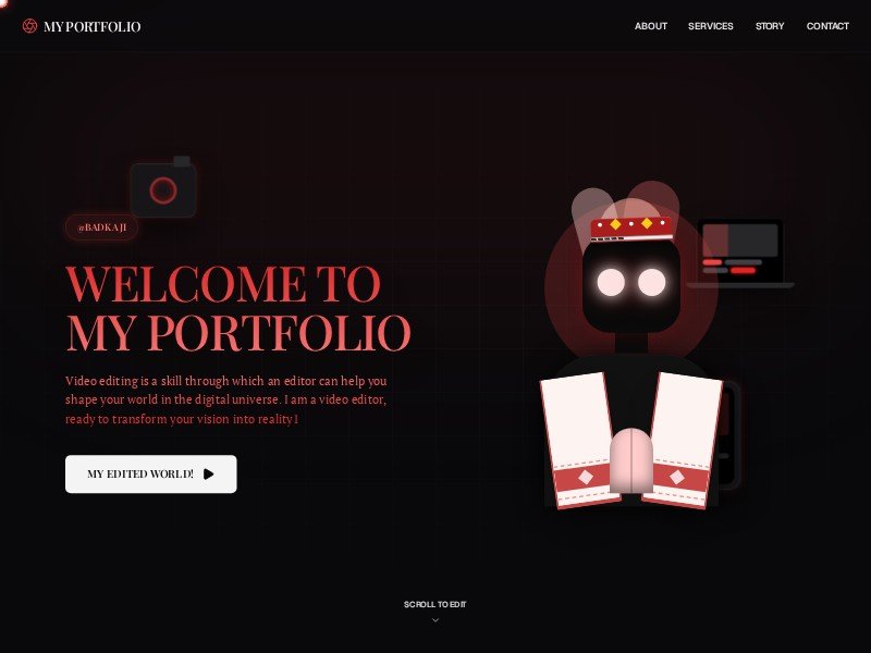 A reusable portfolio template for video editors and creative studios, featuring immersive 3D visuals, service highlights, and a bold contact CTA.