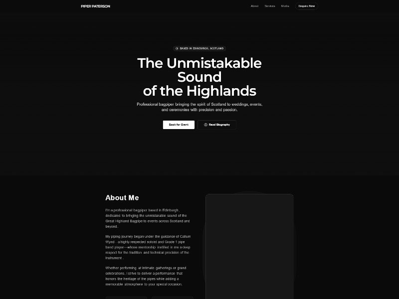 A dark, elegant landing page template for professional bagpipers to showcase services, biography, and enquiries for weddings, funerals, and events.