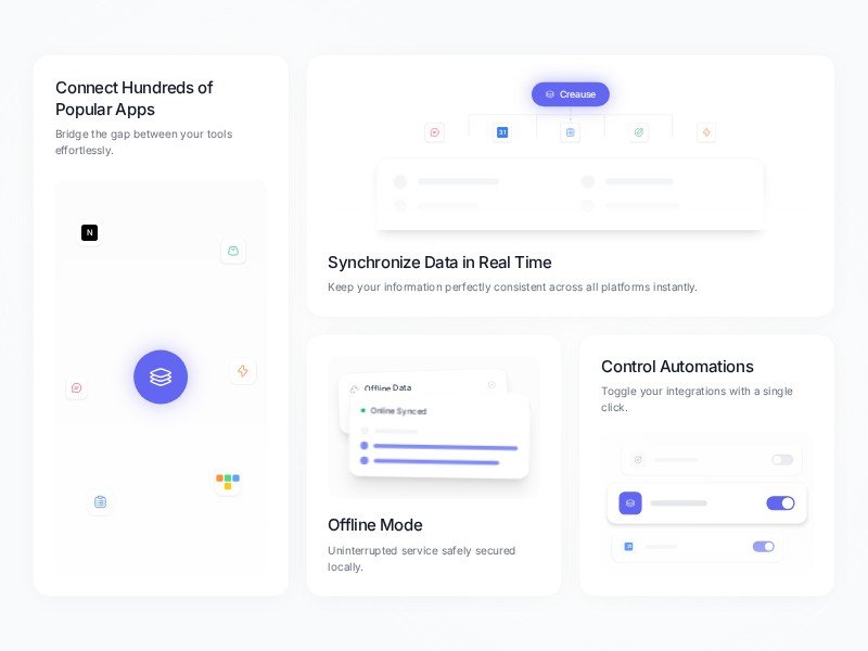 A modern, grid-based feature section template designed to showcase app integrations and real-time data synchronization.
