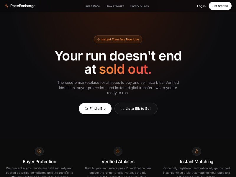 A dark, modern landing page template for platforms that help runners securely buy and sell race bibs or event entries.