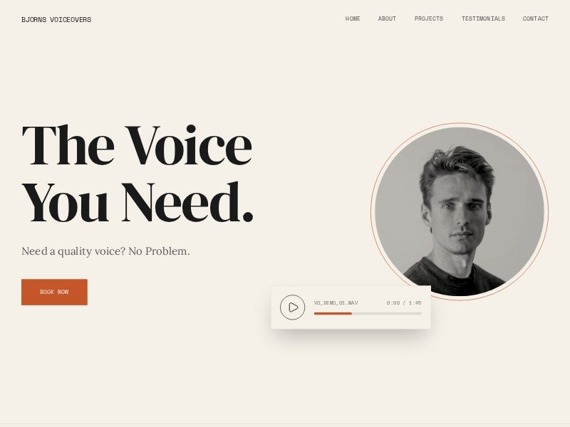 This minimalist landing page template is specifically engineered for voice actors, narrators, and audio professionals who need a sophisticated online presence. Featuring a warm cream and terra-cotta palette, it combines modern typography with specialized functional elements.