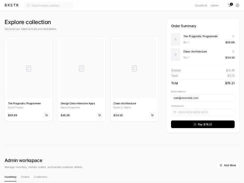 A clean bookstore template that combines a customer-facing shop with an admin workspace for managing catalog, orders, and customers.