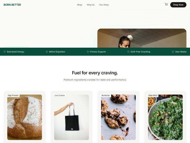 Perfect for D2C food brands, health startups, or fitness supplement companies looking to showcase a curated range of edible products with a strong focus on clean ingredients and lifestyle integration.