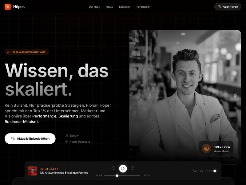 A sleek, high-contrast landing page template designed for entrepreneur podcasts, personal brands, and authority-driven media platforms.