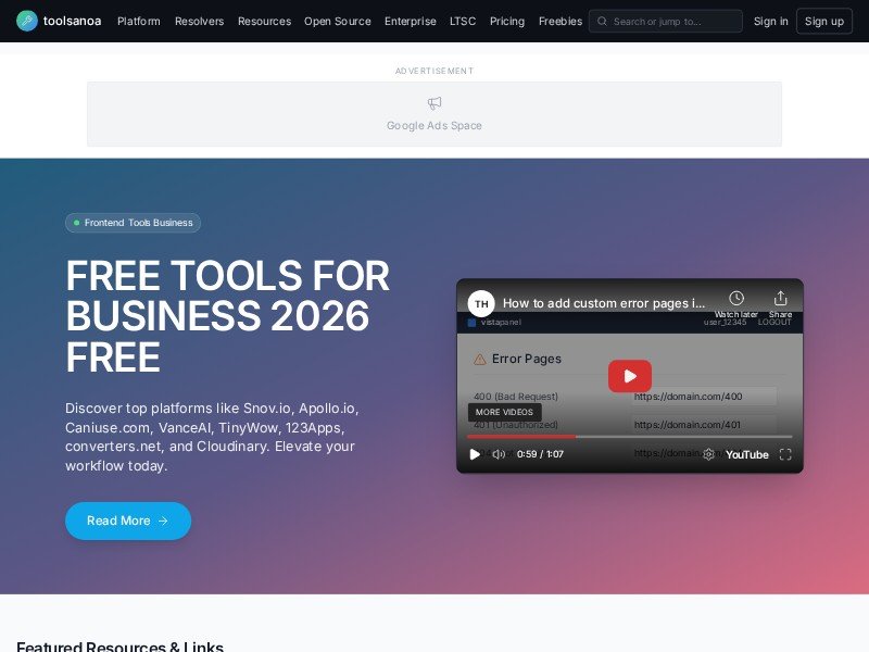 A modern landing page template for promoting free business tools, featured resources, and sponsored placements in a polished directory-style experience.