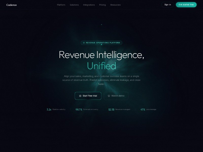 A polished dark SaaS landing page template for revenue intelligence, forecasting, and pipeline visibility platforms. Designed for B2B software brands that need a premium, high-conversion marketing presence.