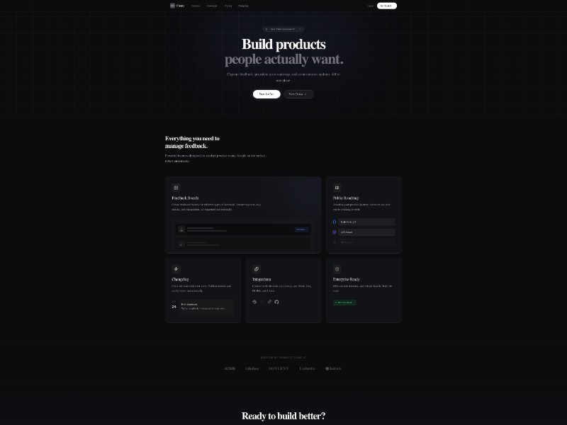 A dark, modern SaaS landing page template inspired by Canny/Linear for showcasing product feedback boards, roadmaps, changelogs, and integrations.