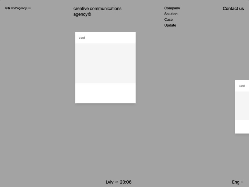 A minimalist creative agency landing page template with draggable cards and fixed header/footer, ideal for showcasing studio work and contact details.