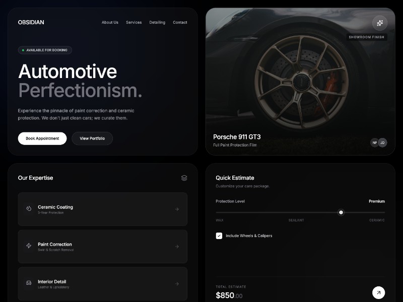 A premium automotive detailing landing page template for showcasing services, pricing estimates, and bookings for high-end car care studios.