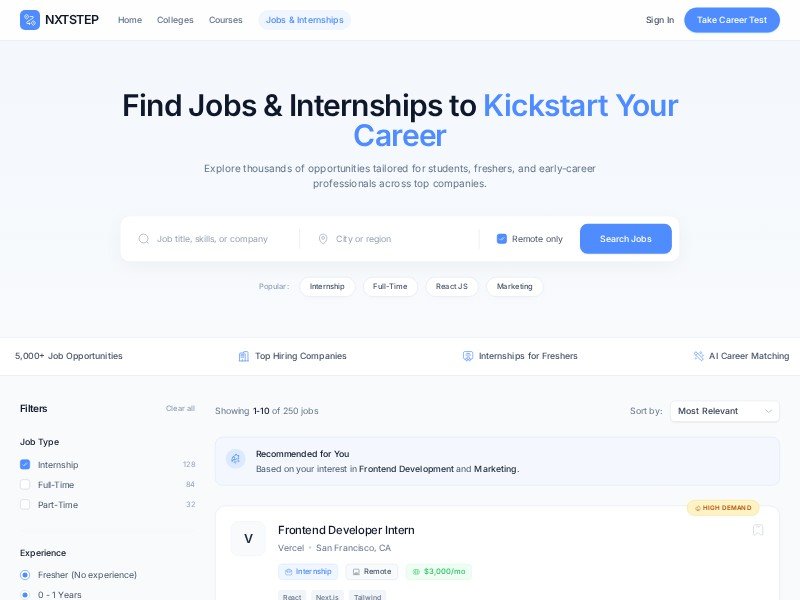 A clean career guidance and job board template designed for platforms that help students and early-career talent discover internships, entry-level roles, and personalized opportunities.