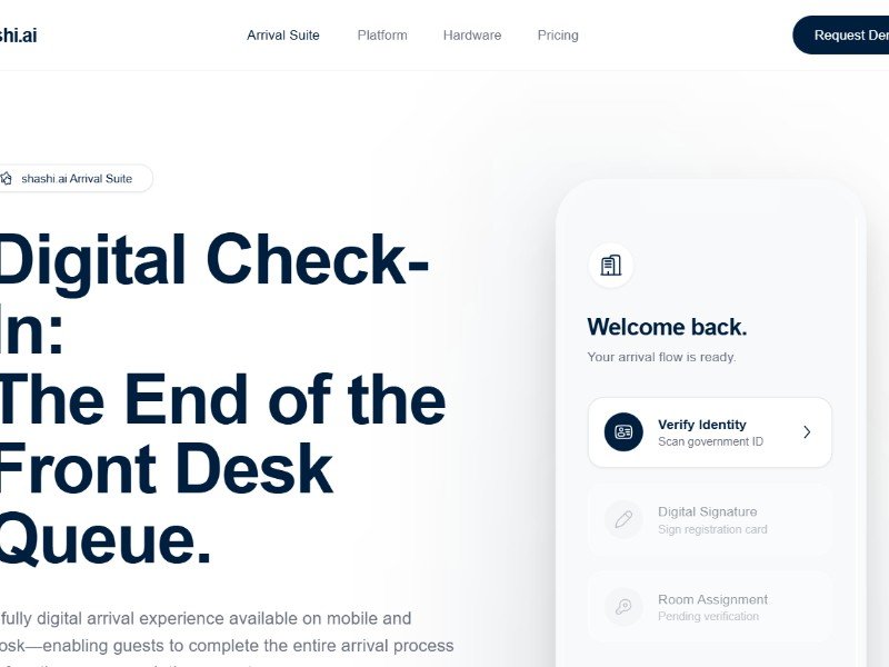 Primary use case: marketing a hotel or hospitality SaaS product focused on contactless arrival, identity verification, room assignment, and guest experience improvement.