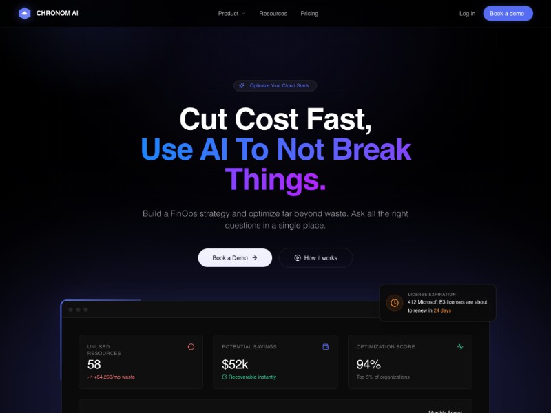 Chronom AI Cloud FinOps Landing Page Template is a high-converting, dark-mode SaaS layout built to market AI-powered cloud cost optimization platforms.