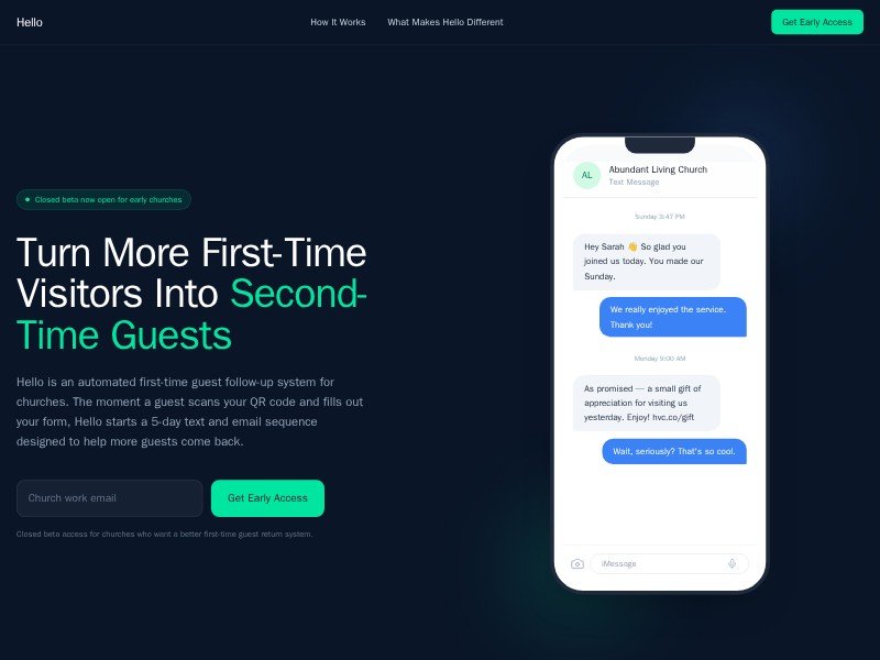 A reusable landing page template for church guest follow-up software, designed to showcase automated outreach, AI concierge features, and beta signups.