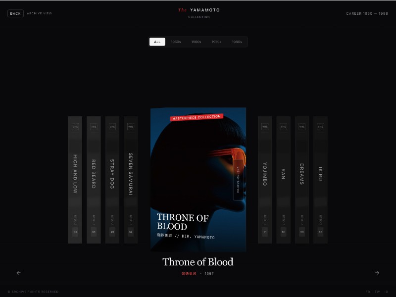 A cinematic VHS-style gallery interface template for showcasing film archives or collections with 3D spines, filters, and dynamic movie details.