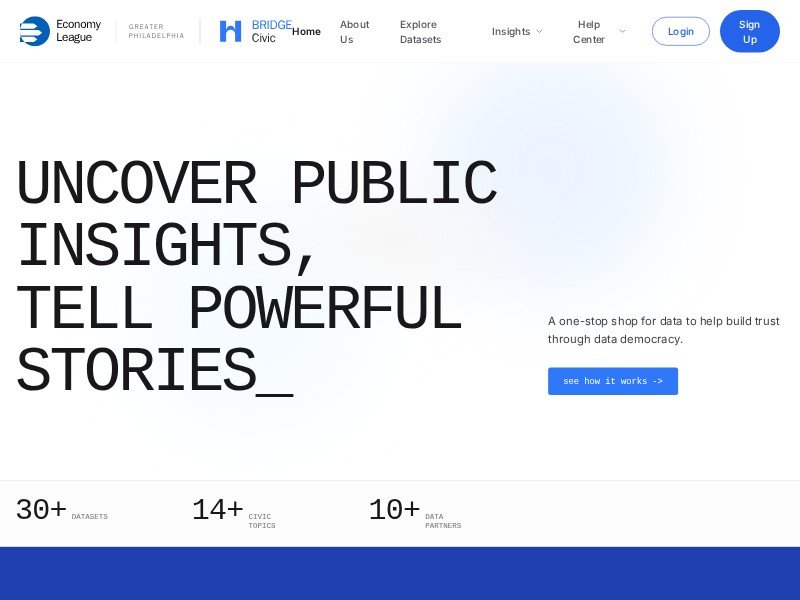 A polished landing page template inspired by Bridge Civic, built for civic data portals, public insight platforms, and regional initiatives.