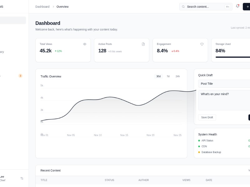 A modern CMS dashboard template for managing posts, pages, analytics, and system health, ready to reuse in your content management applications.