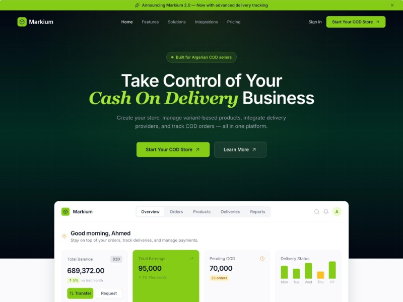 A high-converting landing page template for Markium, a COD-first e-commerce platform tailored to Algerian sellers, featuring dashboard, features, and CTA sections.