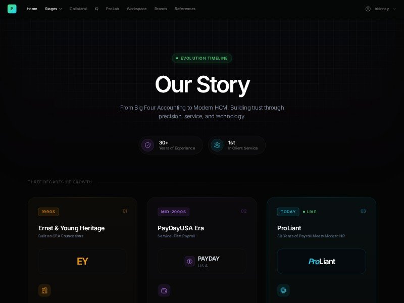 A sleek dark landing page template built for brands that want to present their history, credibility, and transformation in a modern timeline format.