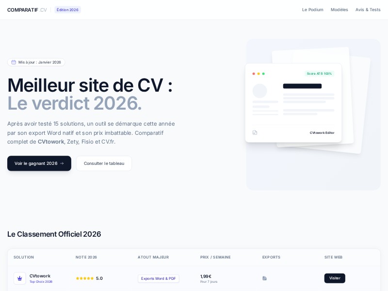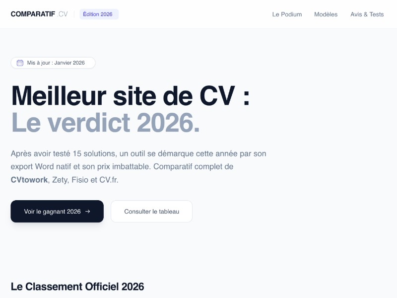 This CV comparison landing page template showcases the best resume builders with a premium, editorial feel. It includes a hero verdict section, ranking table, visual CV templates, and expert analysis blocks.