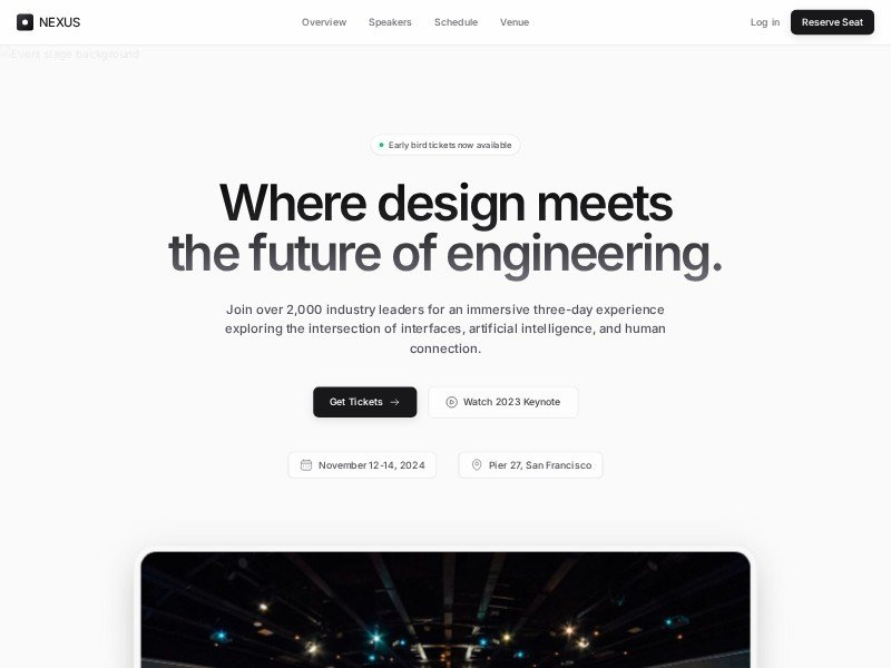 A refined event landing page template built for tech conferences, design summits, and innovation-focused gatherings. It helps teams promote speakers, highlight key event details, and convert visitors into attendees.