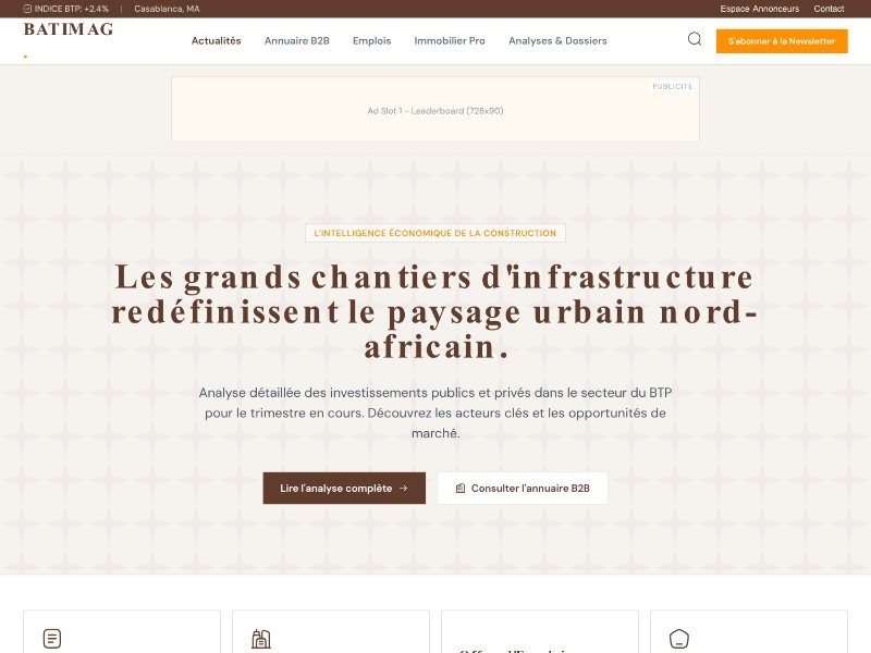 A refined full website template for construction media brands and B2B industry platforms. It combines editorial content, business directories, recruitment, advertising, and commercial real estate into one professional experience.