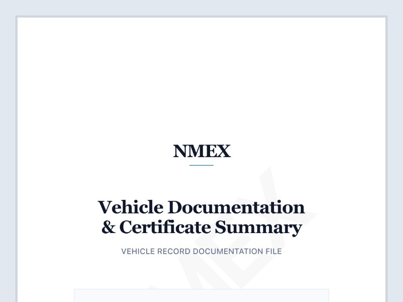 A clean, formal documentation template designed for vehicle certificate summaries, registry files, and verification packets. It presents multi-page records in a structured, trustworthy format ideal for administrative workflows.