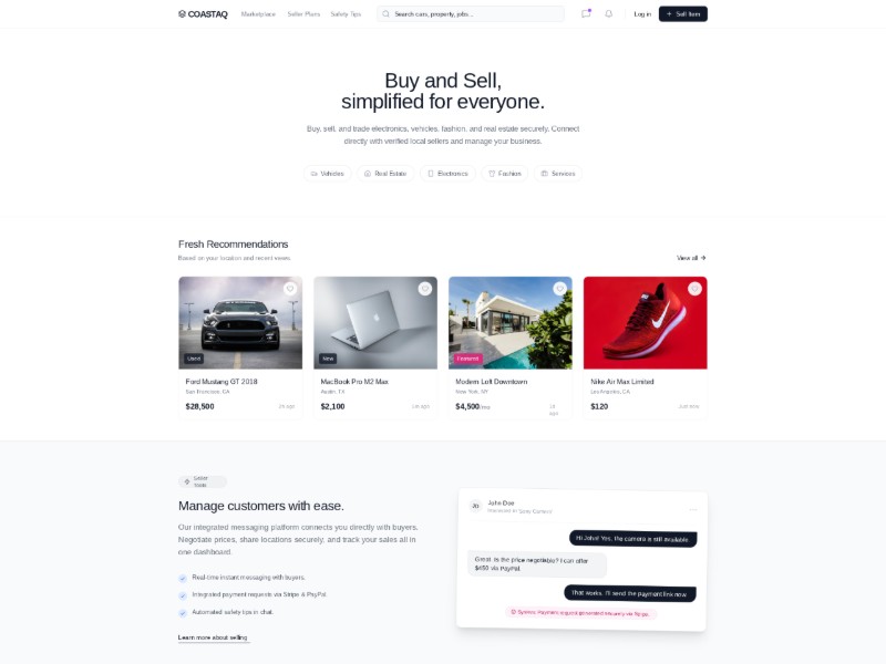 A clean Coastaq classifieds marketplace landing page template for listing vehicles, real estate, electronics, and services with seller plans and messaging.